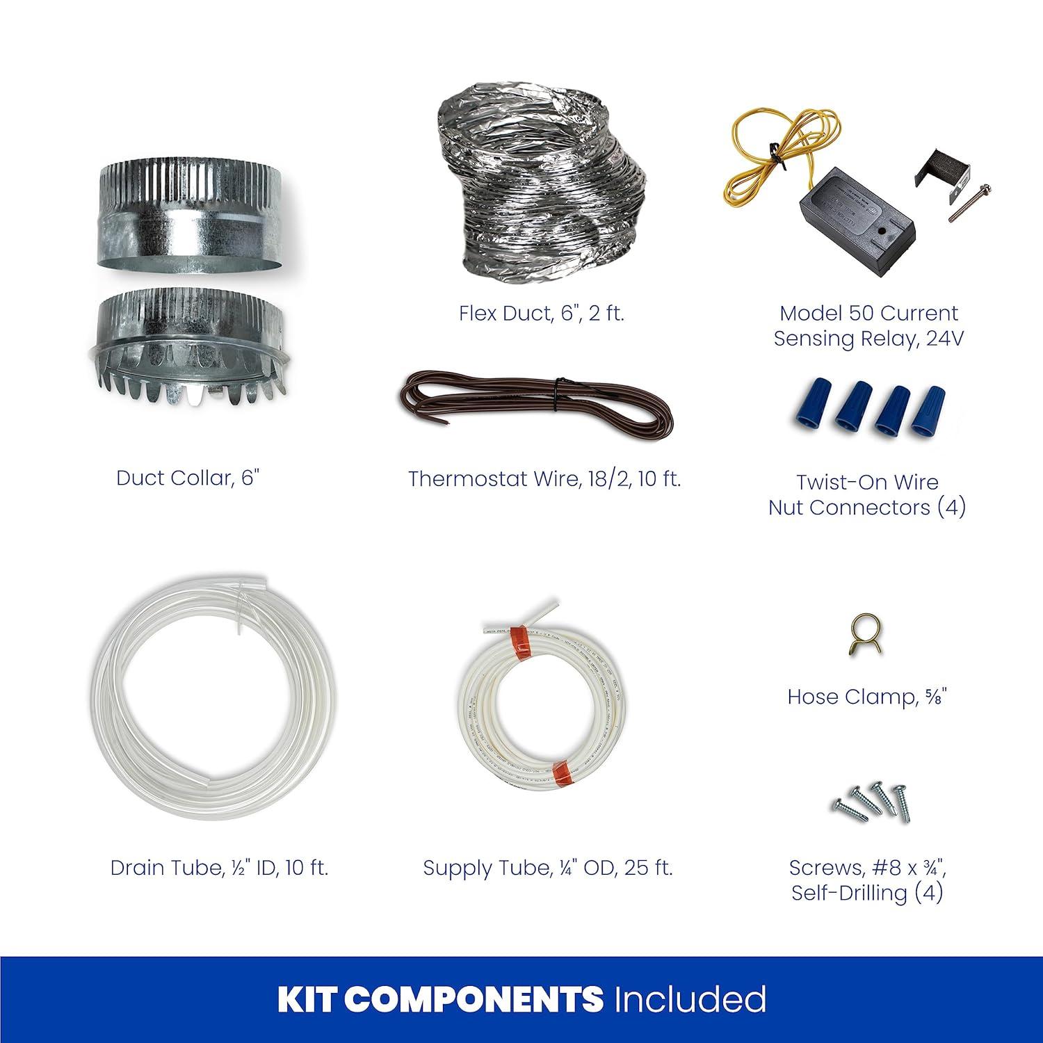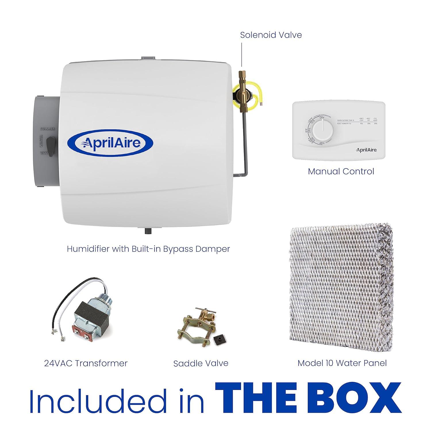 INCLUDED IN THE BOX: Installation instructions and template, humidifier with built-in bypass damper, 24 VAC transformer, manual humidifier control with sensor, saddle valve, solenoid valve, and Model # 10 Water Panel
