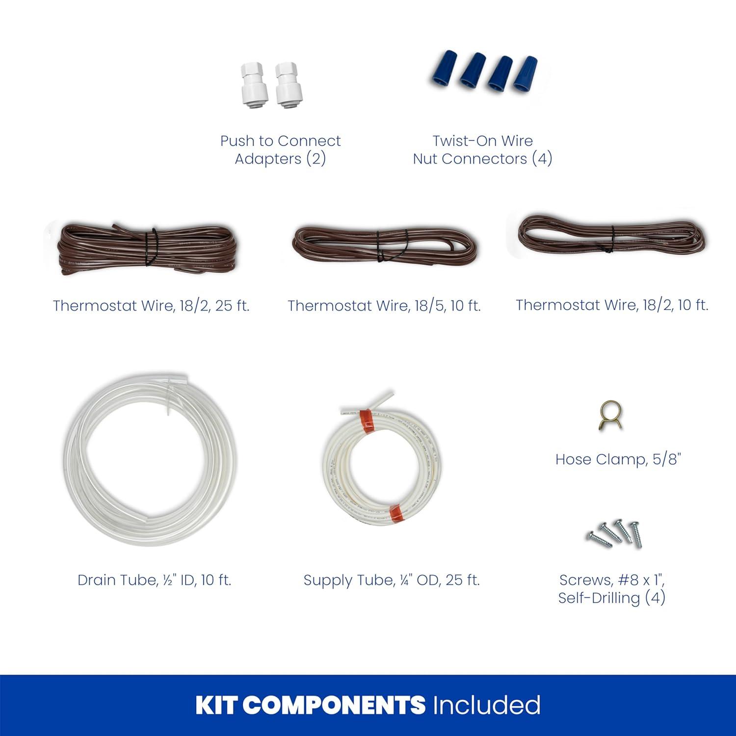 INCLUDES – 700 Whole-House Humidifier, Model 60 Automatic Digital Humidistat, (1) genuine AprilAire 35 Water Panel, (4) #8 x 1-inch Mounting Screws, ¼” outside diameter (OD) Water Supply Tube (25 ft.), ½” interior diameter (ID) Drain Tube (10 ft.), ⅝” Hose Clamp, 18/2 Thermostat Wire (25 ft.), 18/2 Thermostat Wire (10 ft.), 18/5 Thermostat Wire (10 ft.), and (4) Twist-On Wire Nut Connectors