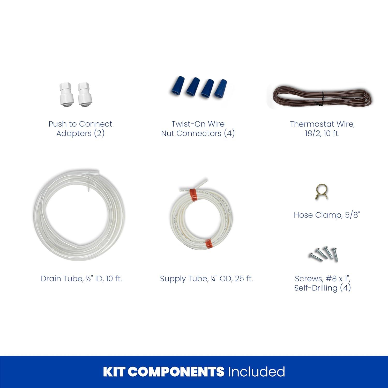 INCLUDED IN THE BOX: Installation instructions and template, humidifier with built-in fan, 24 VAC transformer, manual humidifier control with sensor, saddle valve, solenoid valve, and Model # 35 Water Panel.