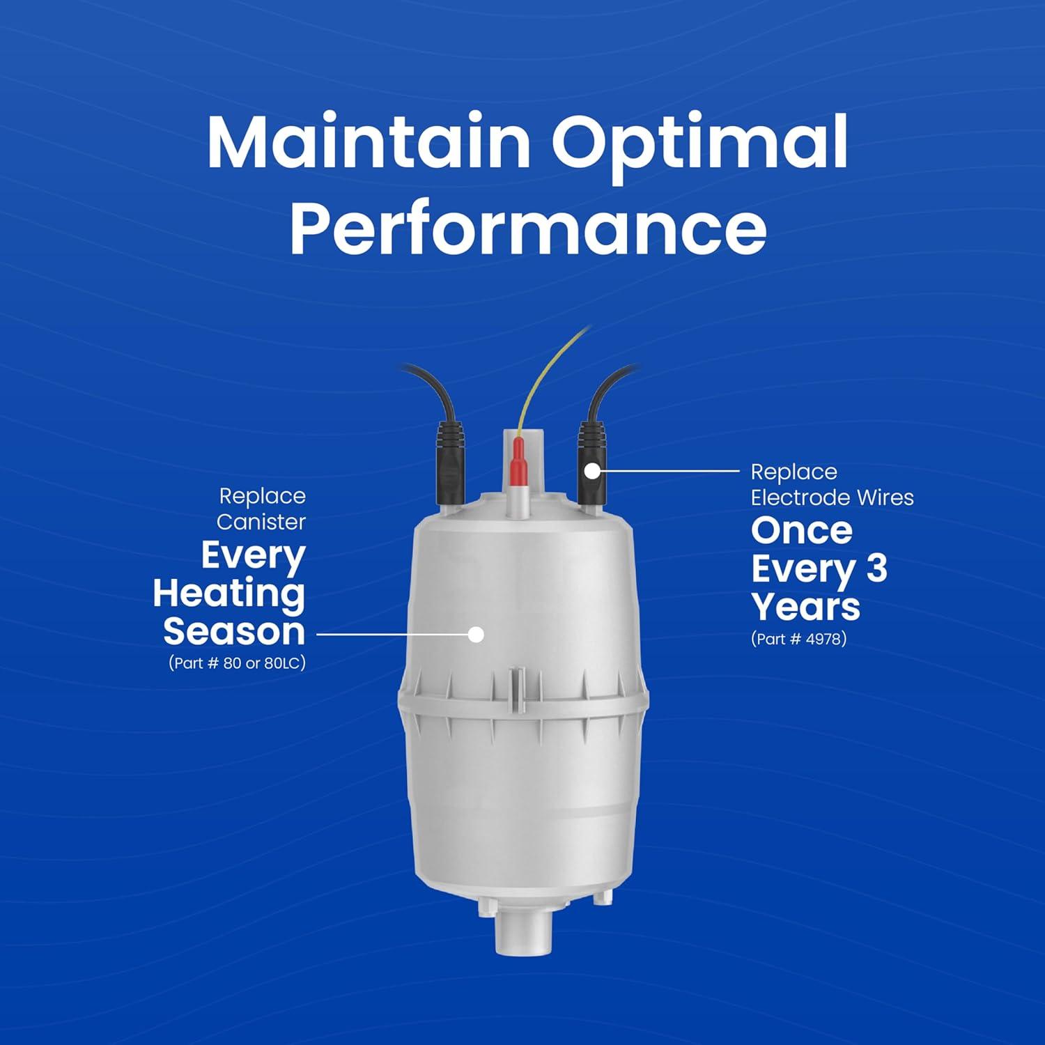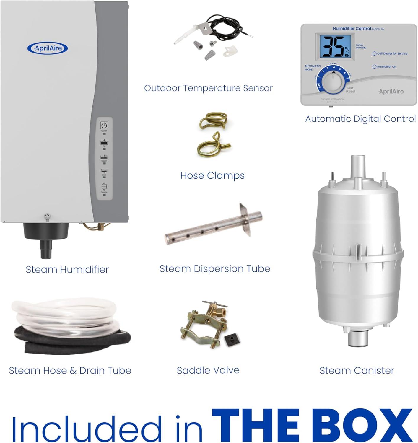 AprilAire introduced the first evaporative humidifier for forced air furnace systems back in 1954. Since that time, AprilAire continues to lead the industry in whole home humidification systems – including steam humidifiers. AprilAire steam humidifiers use electrode technology and are simple to install, operate, and maintain. With electrode technology, electrical current flows between submerged electrodes, resistance of the water to the electric current heats the water. The submerged electrodes are found in a replaceable canister. At the end of a humidifier season, the canister – including the electrodes, is replaced. No cleaning, no scrubbing, simply replace the canister and you’re ready for the next humidifier season. Electrode technology requires impurities in the water to promote the transfer of electricity. For this reason, water filtration is not required with electrode technology, minimizing the complexity of the installation and on-going operating costs. This unit will operate with water hardness between 3 and 36 grains – a very wide range. If reverse osmosis or deionized water is present, plumb the steam humidifier to a water line before the water flows through the reverse osmosis or deionization equipment. INCLUDED IN THE BOX: Installation instructions, steam humidifier, Model 62 automatic digital humidifier control with sensor, outdoor temperature sensor, dispersion tube, steam hose (6 feet), 7/8 inch drain tubing (10 feet), hose clamps, saddle valve, mounting screws, Model # 80 steam canister