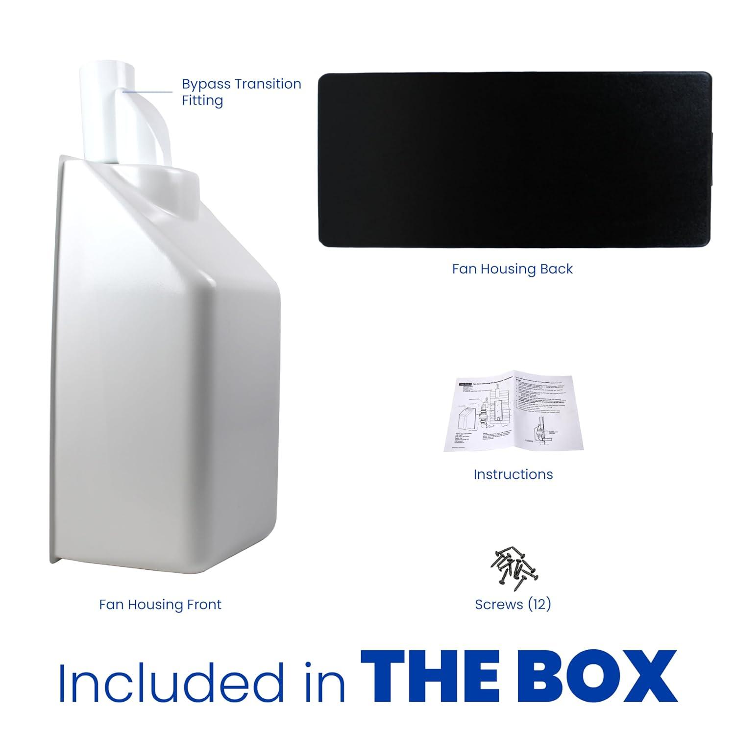 PACKAGE INCLUDES fan housing front and back, bypass transition fitting, twelve screws, and instructions