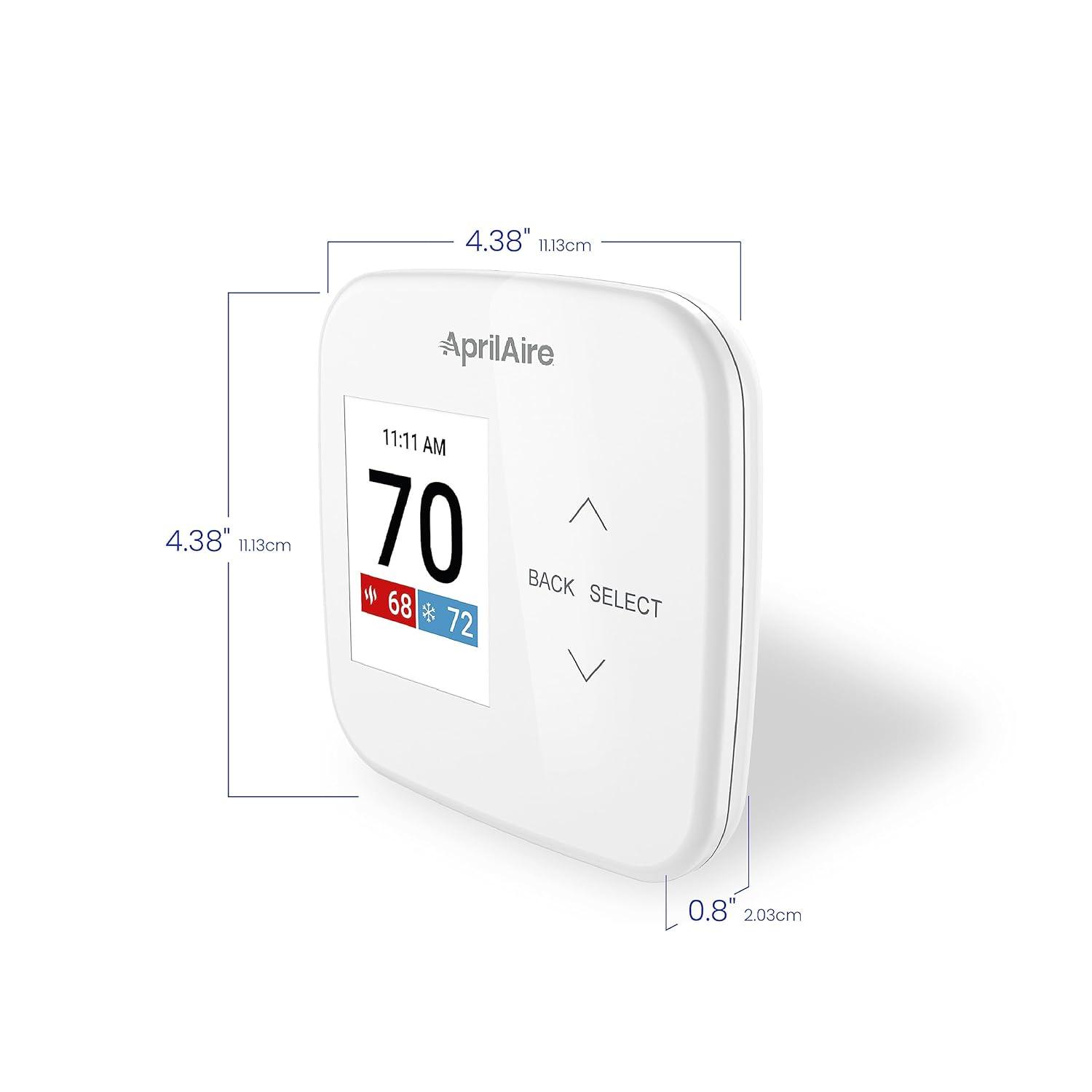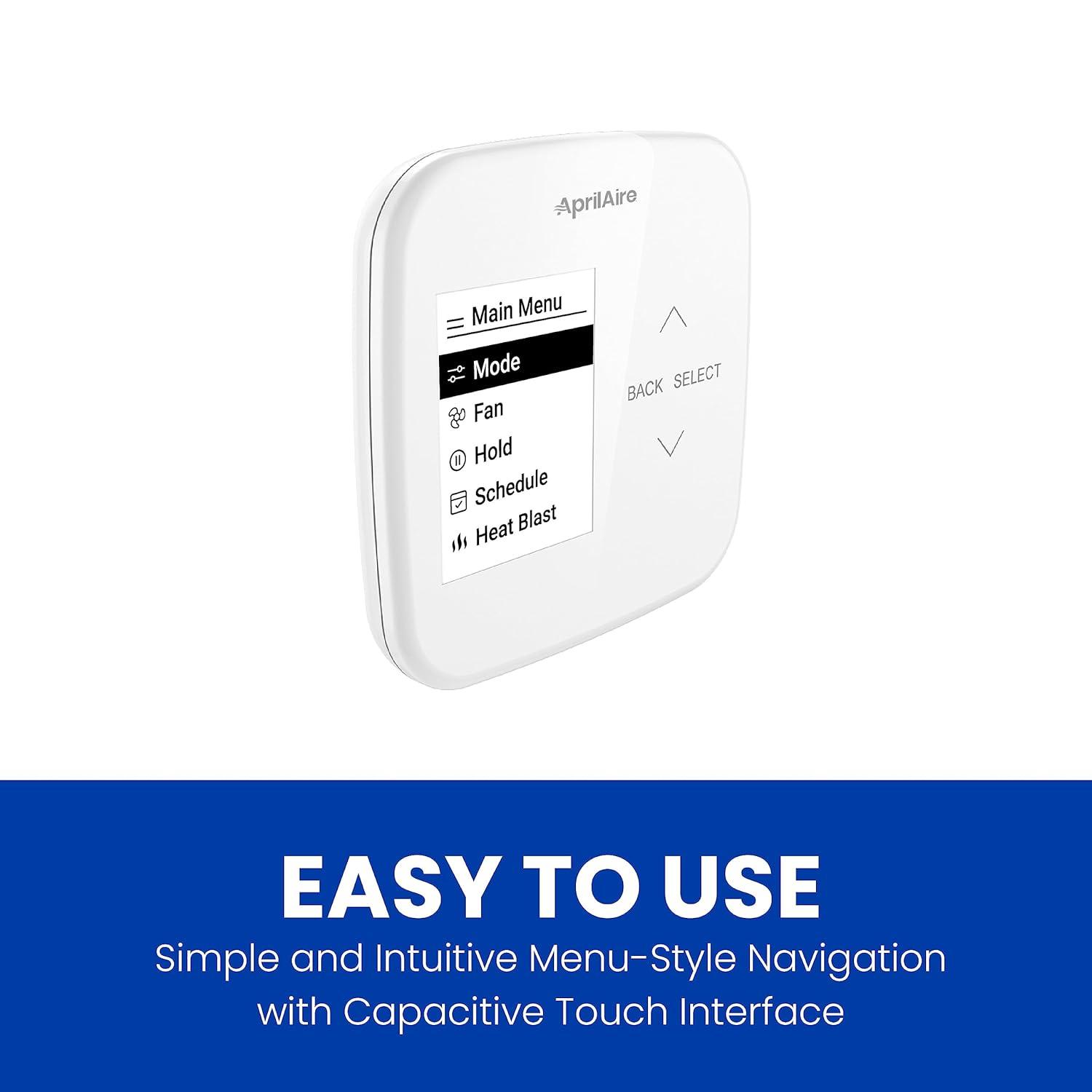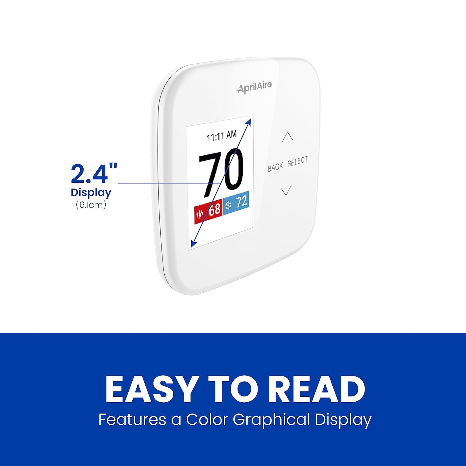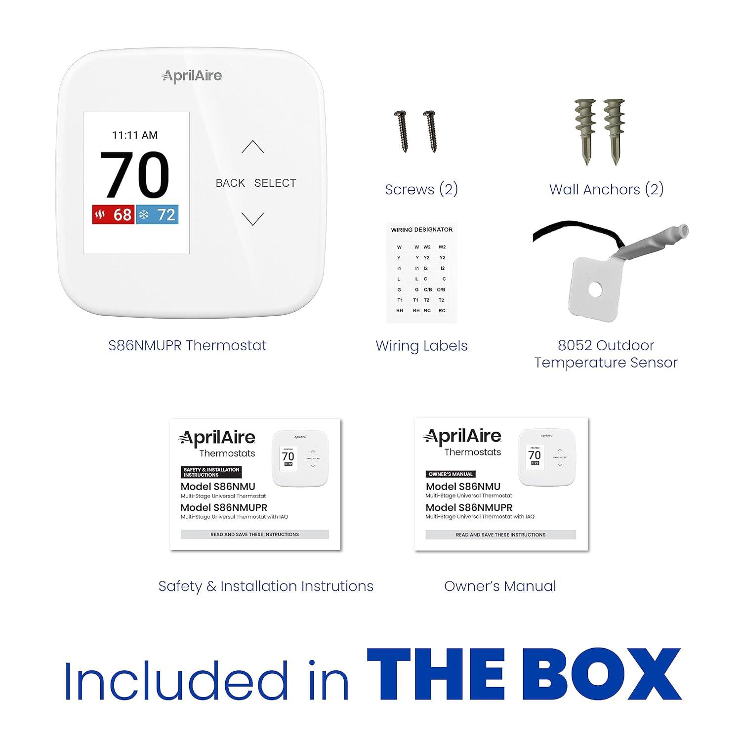 Experience ultimate control over your home's temperature and Indoor Air Quality with the AprilAire S86NMUPR Programmable Thermostat. Effortlessly customize schedules using the best-in-class setup options, including all days, weekdays, weekends, or 7-day programmability. Utilize vacation mode, daylight saving time ready, and auto switching heat/cool functions for added convenience. The 2.4″ diagonal (6.1cm) color LCD interface provides easy programming with clear instructions, eliminating the need for complicated codes and manuals. Enjoy the Heat Blast feature, instantly raising the temperature by 3° to 5°F and Progressive Recovery, ensuring your desired temperature is reached precisely on time. Stay comfortable and enjoy personalized settings on your own schedule. This intelligent thermostat is heat pump compatible and also offers reminder alerts for air filter replacements and HVAC system service checks, and provides convenient control of your humidifier, dehumidifier, or ventilation system so you can manage your home's Indoor Air Quality with ease. Displaying real-time room temperature, humidity level, set temperature, and outdoor temperature (with outdoor temperature sensor), it provides comprehensive information for your comfort, benefit, and peace of mind.